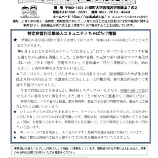 平成17年西福沢の山あいに5人の仲間と団体を立ち上げ、親子の居場所として地域ボランティアが始まりました。場所は川俣町羽山の森美術館近くの高台の空き民家、野山を駆け巡り元気に遊ぶ子どもたち、趣味を通して笑顔になっていくママたち。他町村から嫁いだママにはホッとできる場所が必要と感じて継続してきました。
