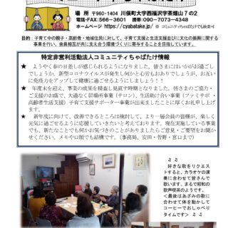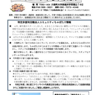 平成17年西福沢の山あいに5人の仲間と団体を立ち上げ、親子の居場所として地域ボランティアが始まりました。場所は川俣町羽山の森美術館近くの高台の空き民家、野山を駆け巡り元気に遊ぶ子どもたち、趣味を通して笑顔になっていくママたち。他町村から嫁いだママにはホッとできる場所が必要と感じて継続してきました。